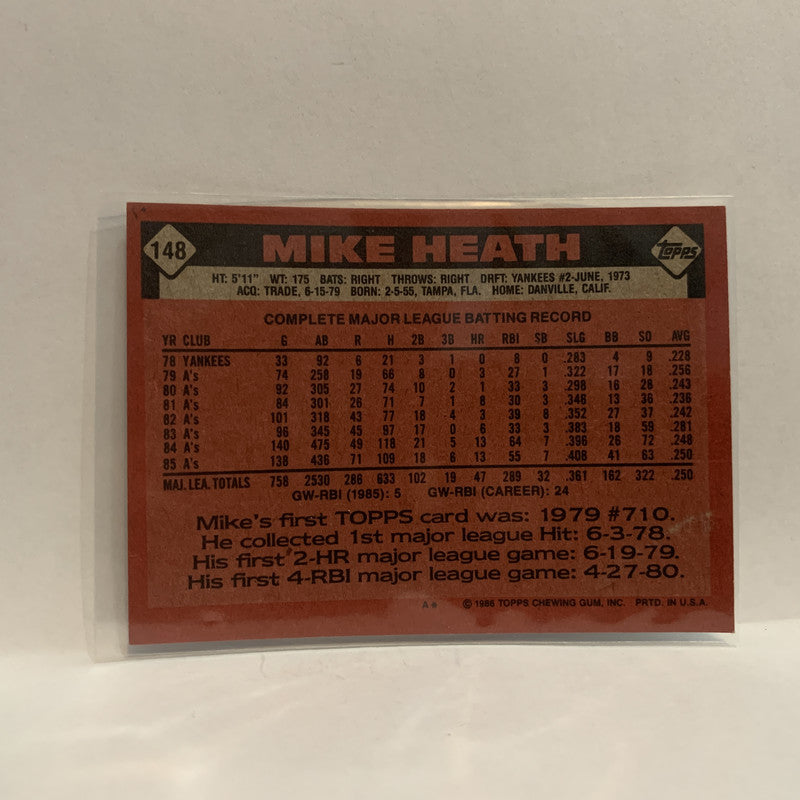 #148 Mike Heath Oakland Athletics 1986 Topps Baseball Card IE