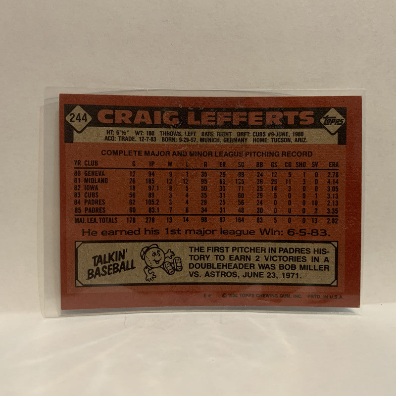 #244 Craig Lefferts San Diego Padres 1986 Topps Baseball Card IF