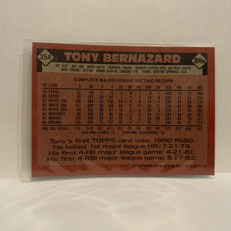 #354 Tony Bernazard Cleveland Indians 1986 Topps Baseball Card IH