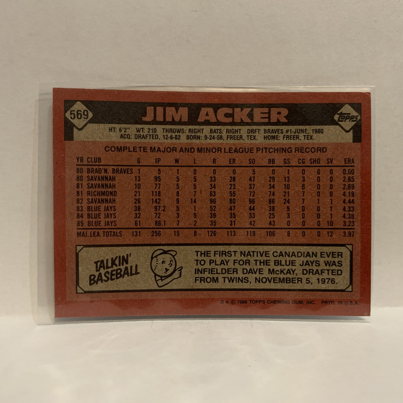 #569 Jim Acker Toronto Blue Jays 1986 Topps Baseball Card IG