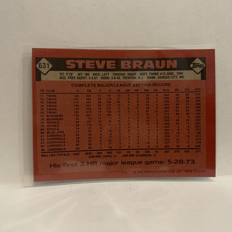 #631 Steve Braun St Louis Cardinals 1986 Topps Baseball Card IH