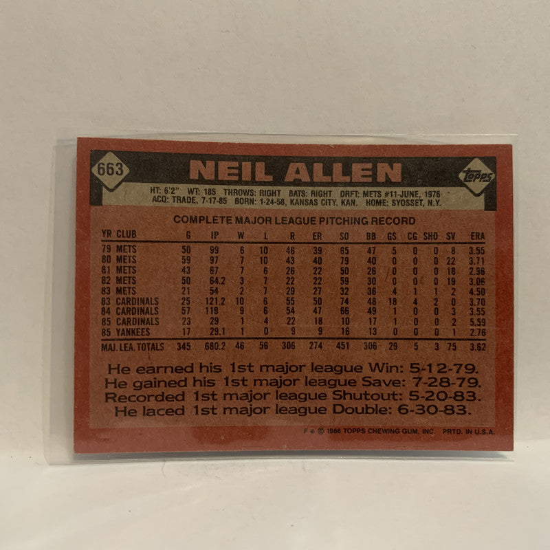 #663 Neil Allen New York Yankees 1986 Topps Baseball Card ID