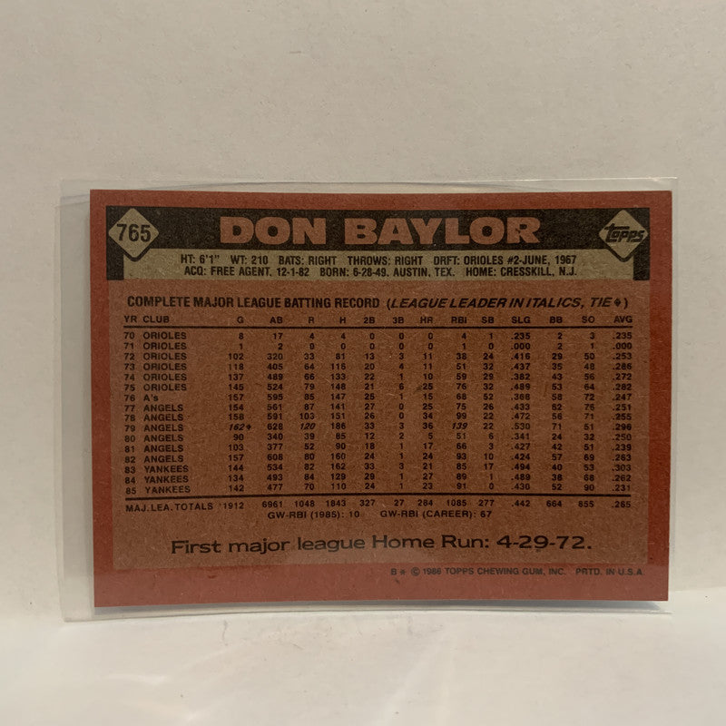 #765 Don Baylor New York Yankees 1986 Topps Baseball Card ID