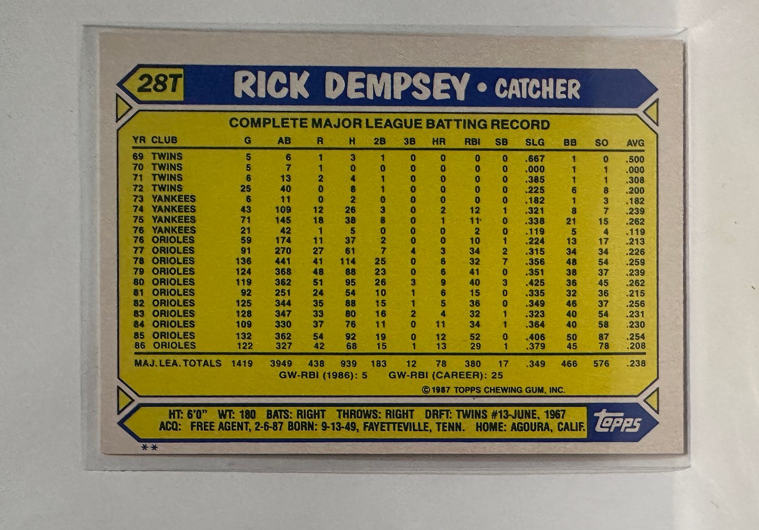 #28T Rick Dempsey Cleveland Indians 1987 Topps Baseball Card
