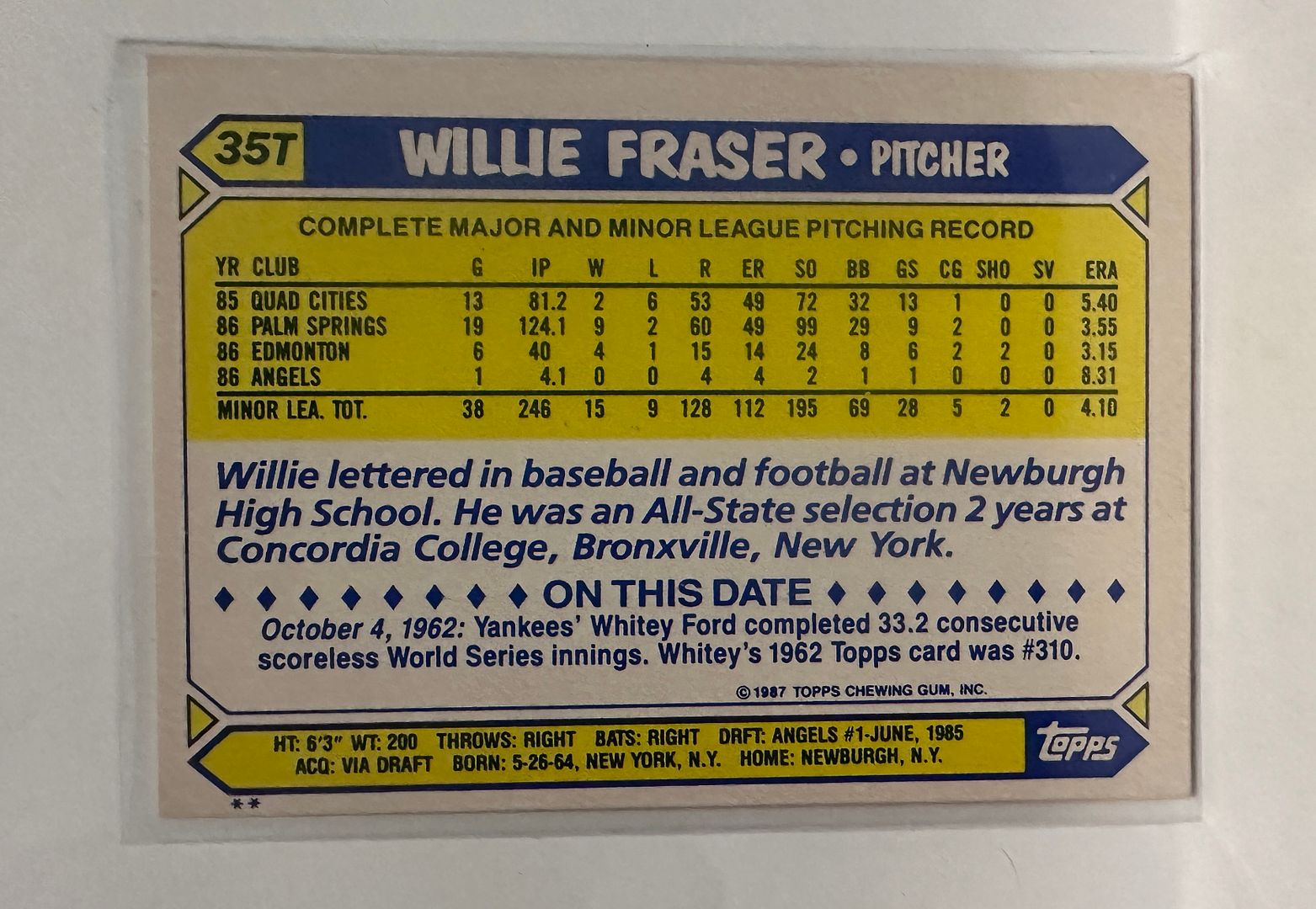 #35T Willie Fraser Los Angeles Angels 1987 Topps Baseball Card