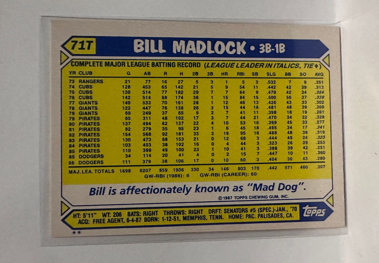 #71T Bill Madlock Detroit Tigers 1987 Topps Baseball Card