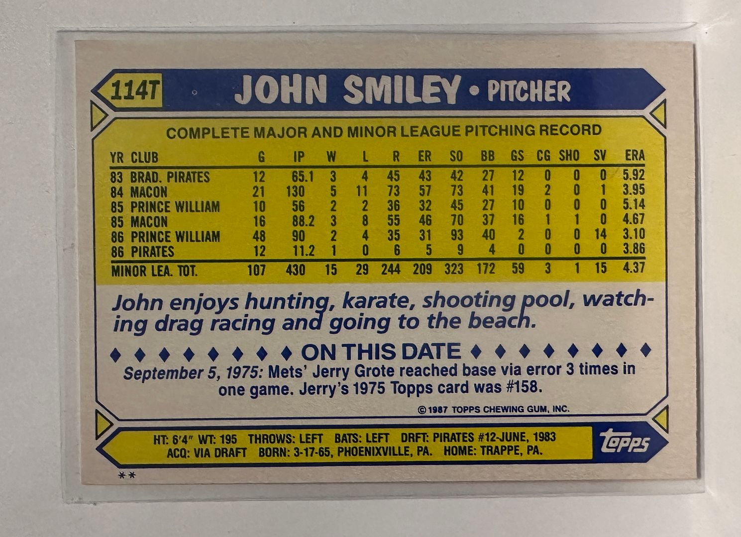 #114T John Smiley Pittsburgh Pirates 1987 Topps Baseball Card