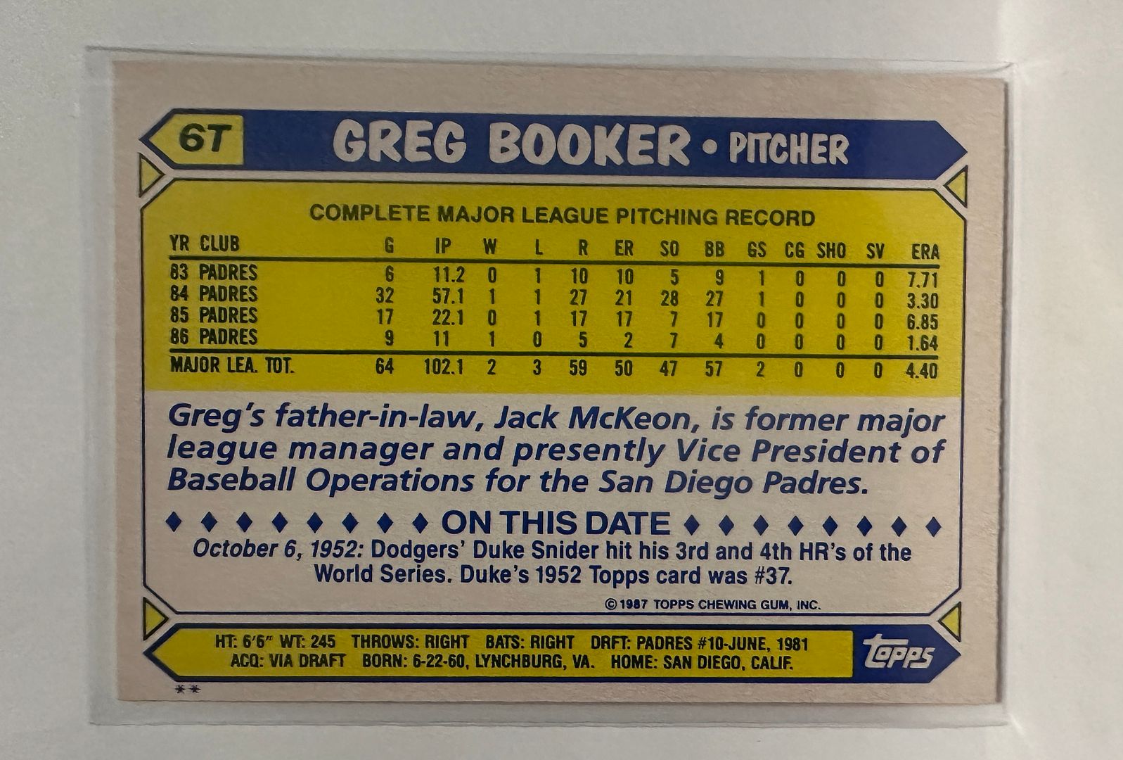 #6T Greg Booker San Diego Padres 1987 Topps Baseball Card