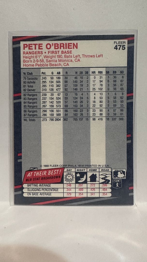 #475 Pete O'Brien Texas Rangers 1988 Fleer Baseball Card
