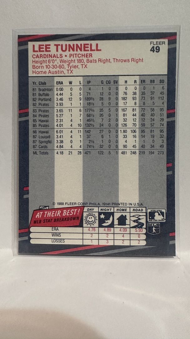 #49 Lee Tunnell St Louis Cardinals 1988 Fleer Baseball Card