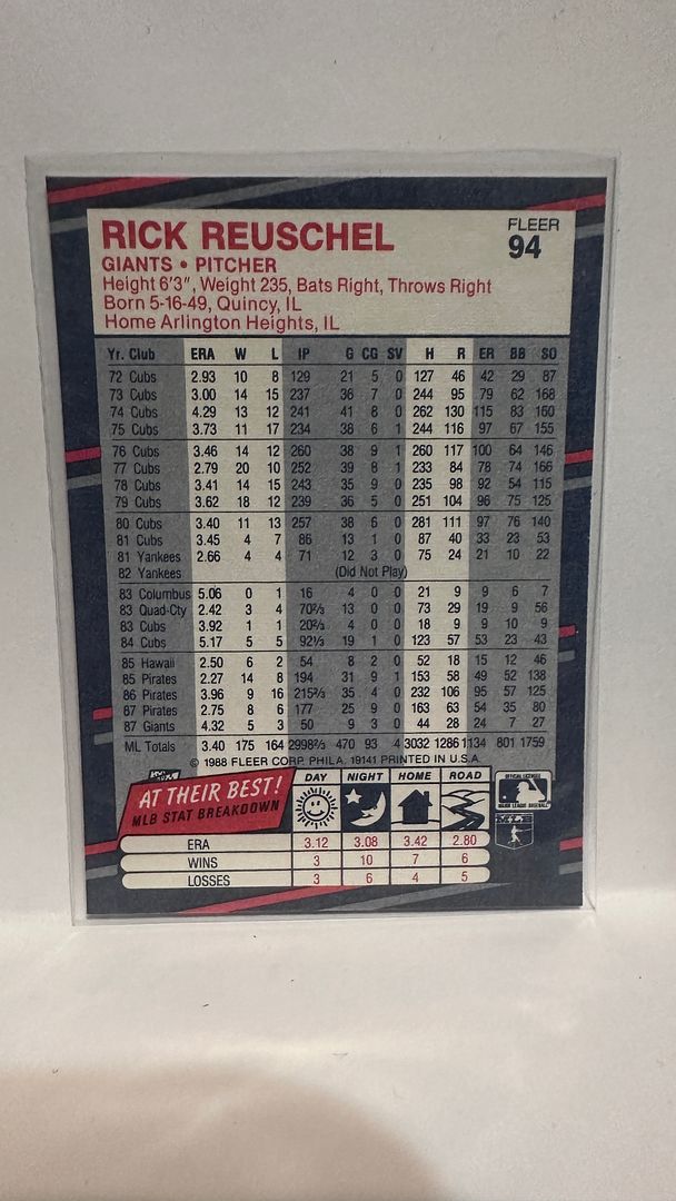 #94 Rick Reuschel SAN Francisco Giants 1988 Fleer Baseball Card