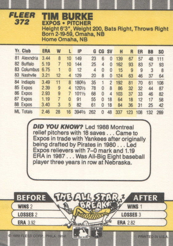 #372 Tim Burke Montreal Expos 1989 Fleer Baseball Card OF