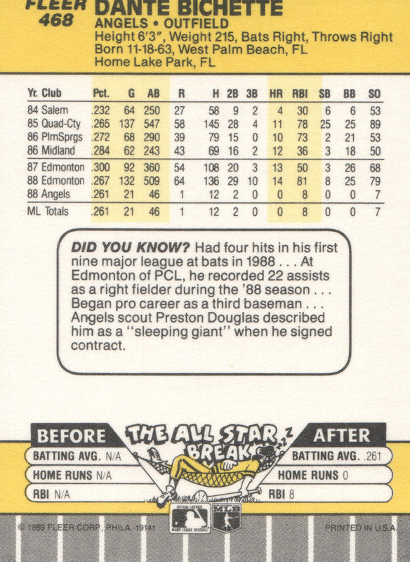 #468 Dante Bichette Los Angeles Angels 1989 Fleer Baseball Card OF