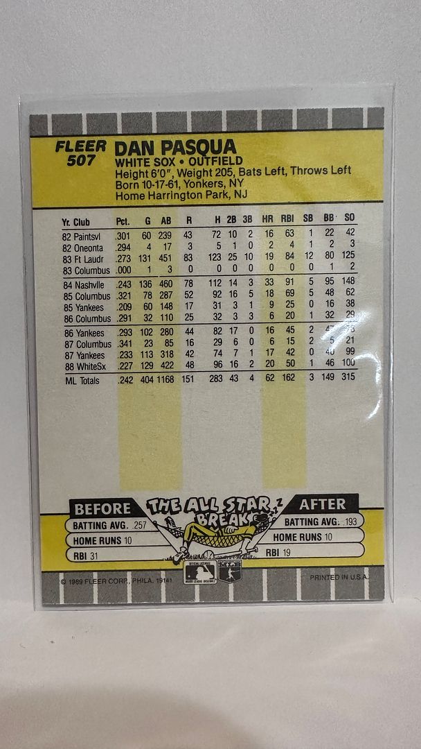 #507 Dan Pasqua Chicago White Sox 1989 Fleer Baseball Card