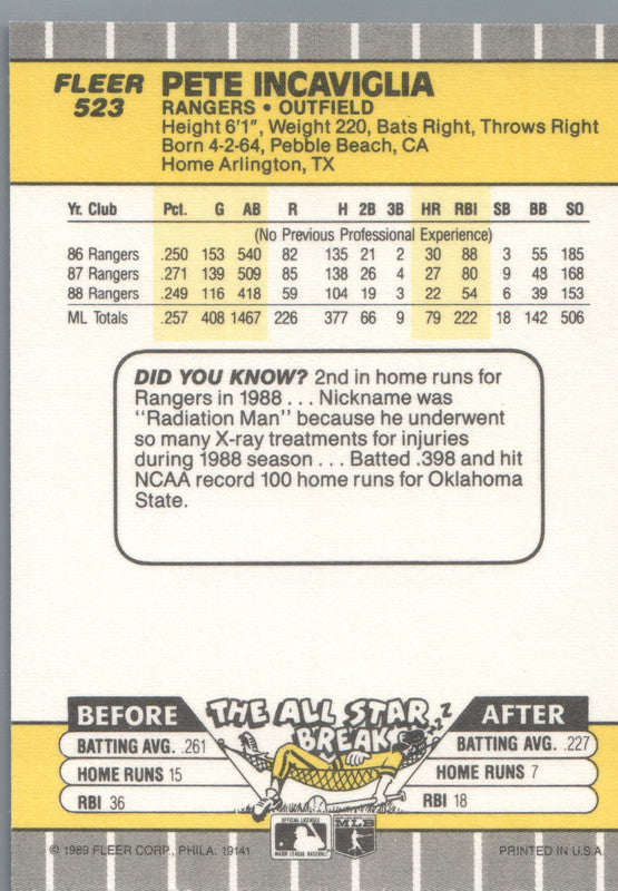 #523 Pete Incaviglia Texas Rangers 1989 Fleer Baseball Card OF