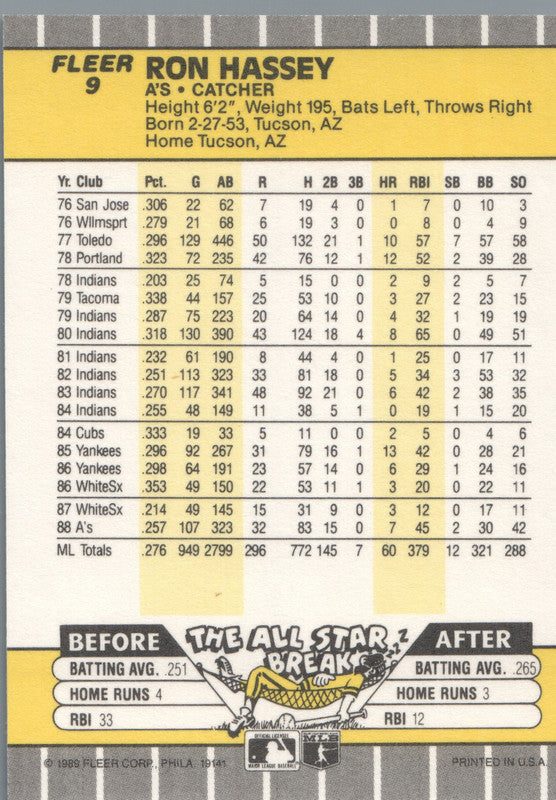 #9 Ron Hassey Oakland Athletics 1989 Fleer Baseball Card OF