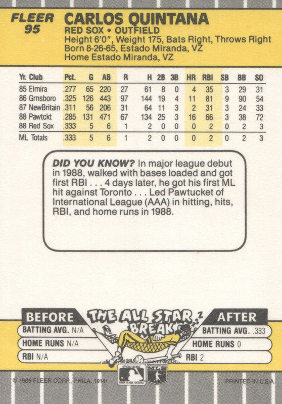 #95 Carlos Quintana Boston Red Sox 1989 Fleer Baseball Card OF