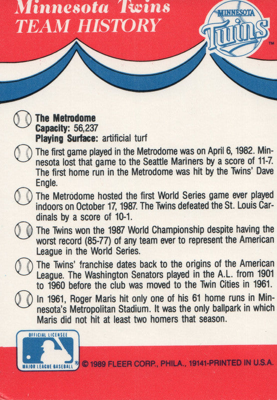 Baseball Sticker Teams Minnesota Twins 1989 Fleer Baseball Card OD