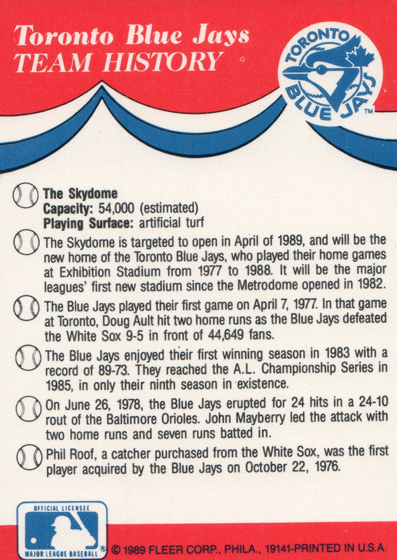Baseball Sticker Toronto Blue Jays 1989 Fleer Baseball Card OC