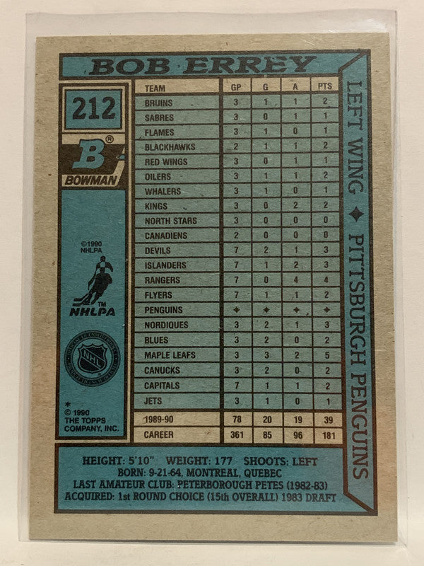 #212 Bob Errey Pittsburgh Penguins 1990-91 Bowman Hockey Card NHL
