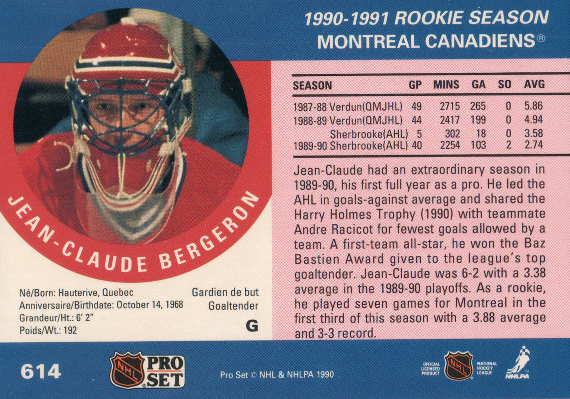 #614 Jean-Claude Bergeron Rookie Montreal Canadiens 1990-91 Pro Set Hockey Card OD