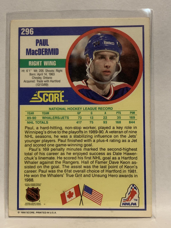 #296 Paul MacDermid Winnipeg Jets 1990-91 Score Hockey Card