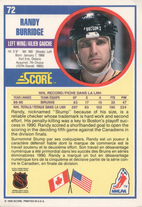 #72 Randy Burridge Rookie Boston Bruins 1990-91 Score Hockey Card