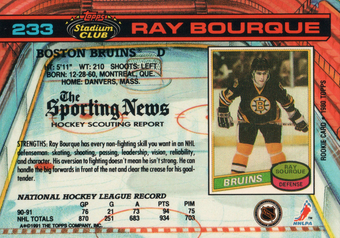#233 Ray Bourque Boston Bruins 1990-91 Topps Stadium Club Hockey Card OT