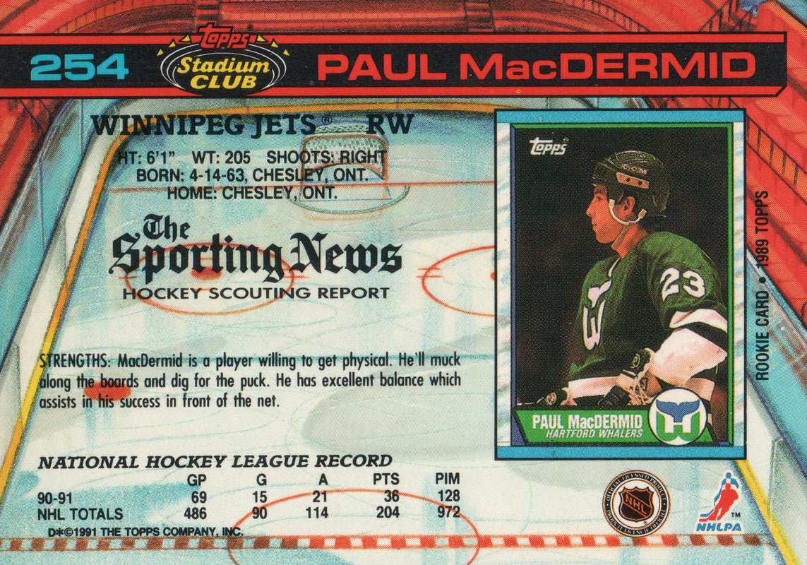 #254 Paul MacDermid Winnipeg Jets 1990-91 Topps Stadium Club Hockey Card OO