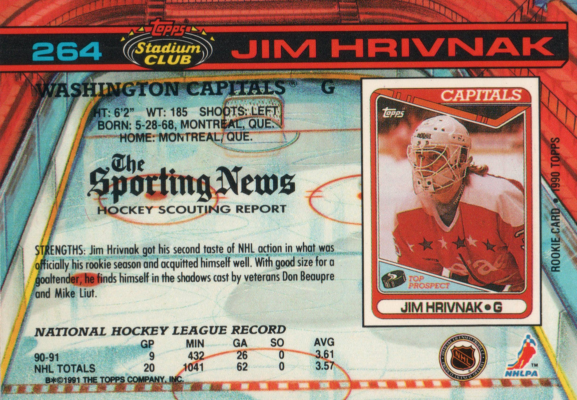 #264 Jim Hrivnak Washington Capitals 1990-91 Topps Stadium Club Hockey Card OO