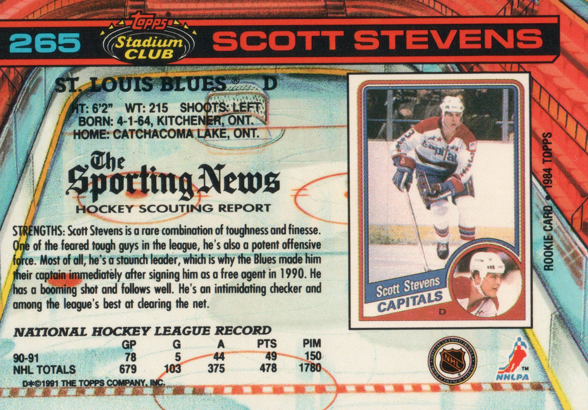 #265 Scott Stevens St Louis Blues 1990-91 Topps Stadium Club Hockey Card OO