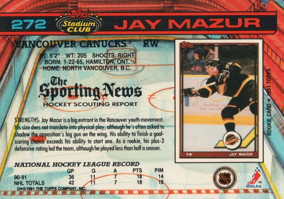 #272 Jay Mazur Vancouver Canucks 1990-91 Topps Stadium Club Hockey Card OO