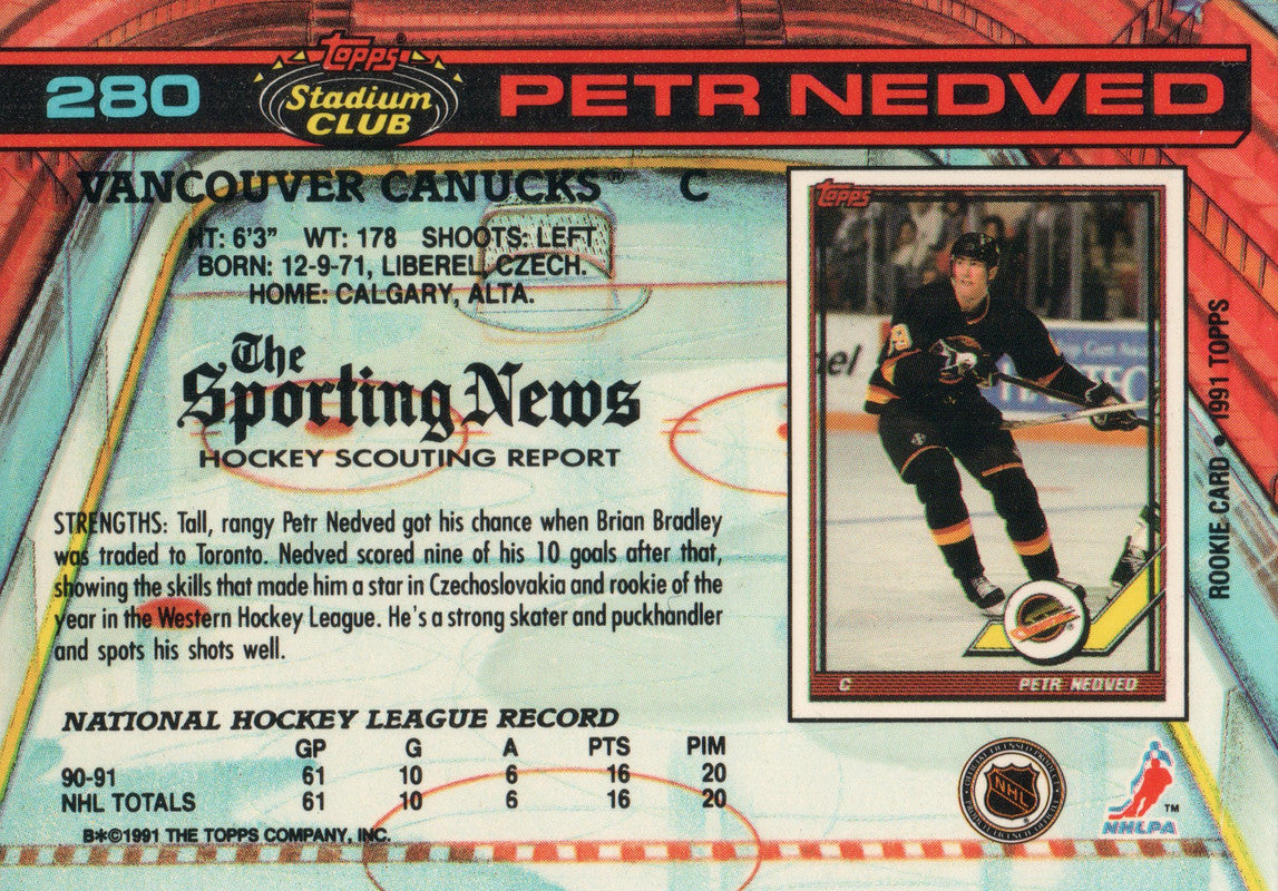 #280 Petr Nedved Vancouver Canucks 1990-91 Topps Stadium Club Hockey Card OP