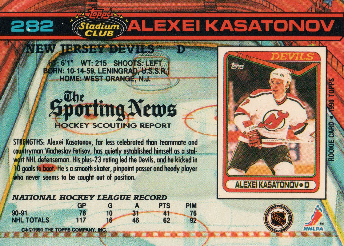 #282 Alexei Kasatonov New Jersey Devils 1990-91 Topps Stadium Club Hockey Card OP