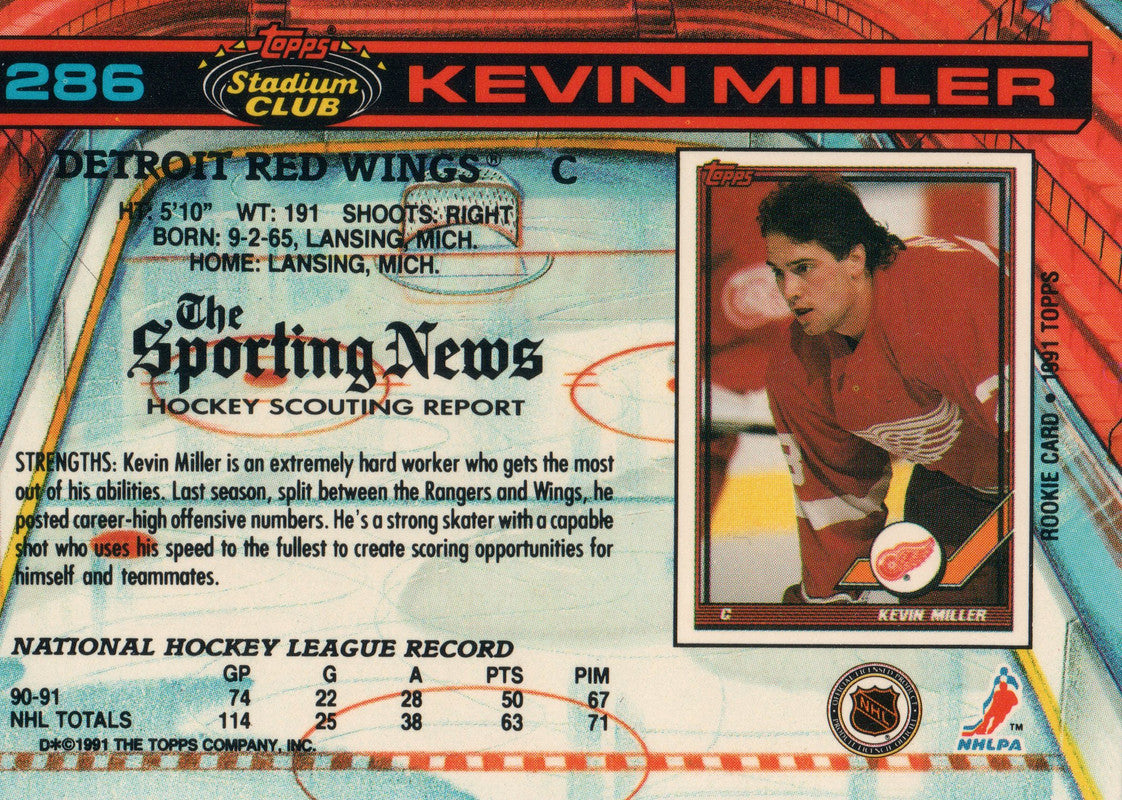 #286 Kevin Miller Detroit Red Wings 1990-91 Topps Stadium Club Hockey Card OS