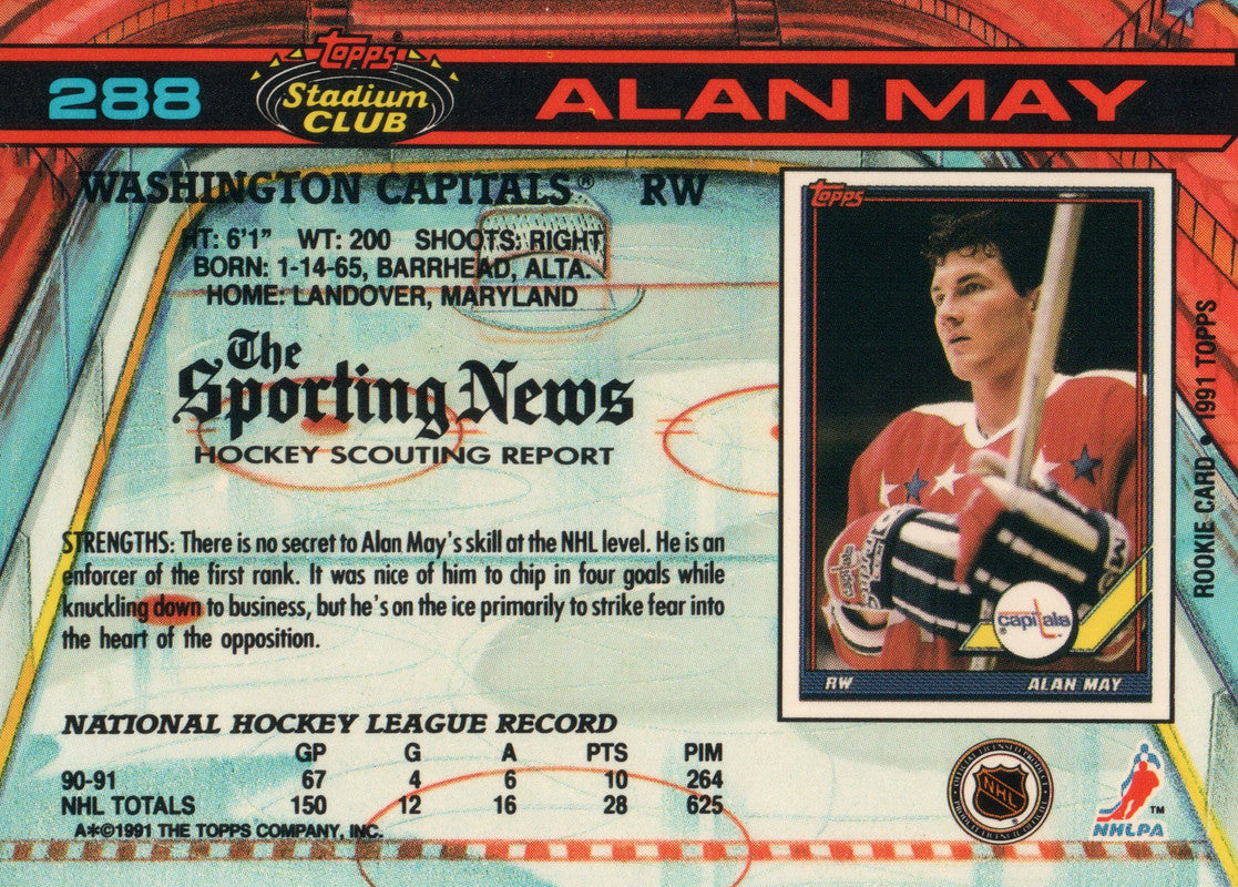 #288 Alan May Washington Capitals 1990-91 Topps Stadium Club Hockey Card OS