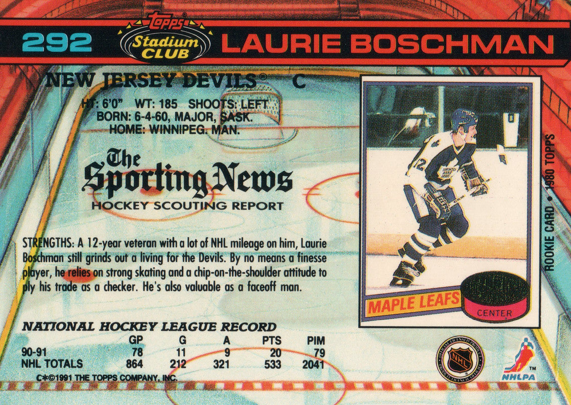 #292 Laurie Boschman New Jersey Devils 1990-91 Topps Stadium Club Hockey Card OS