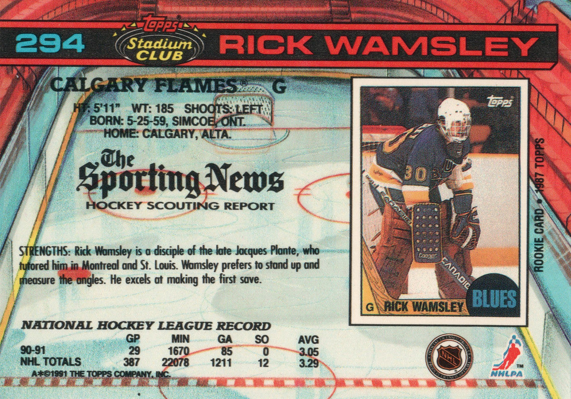 #294 Rick Wamsley Calgary Flames 1990-91 Topps Stadium Club Hockey Card OS