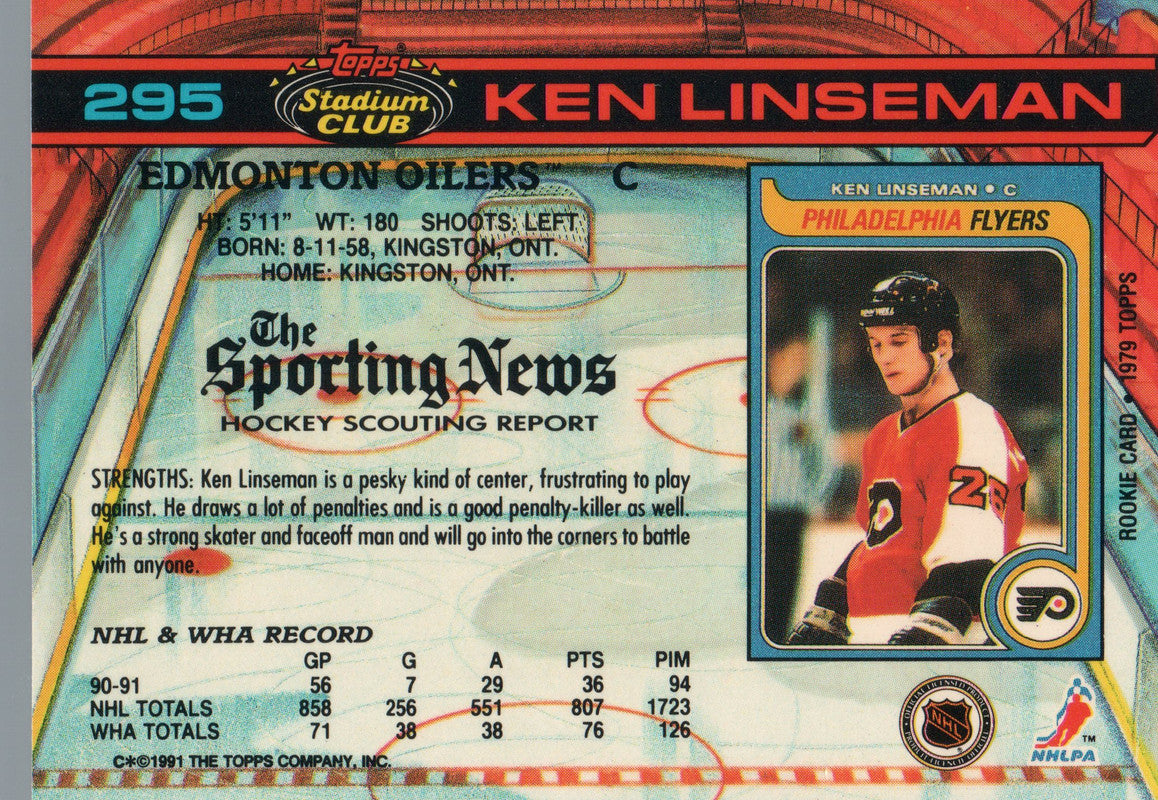 #295 Ken Linsman Edmonton Oilers 1990-91 Topps Stadium Club Hockey Card OS