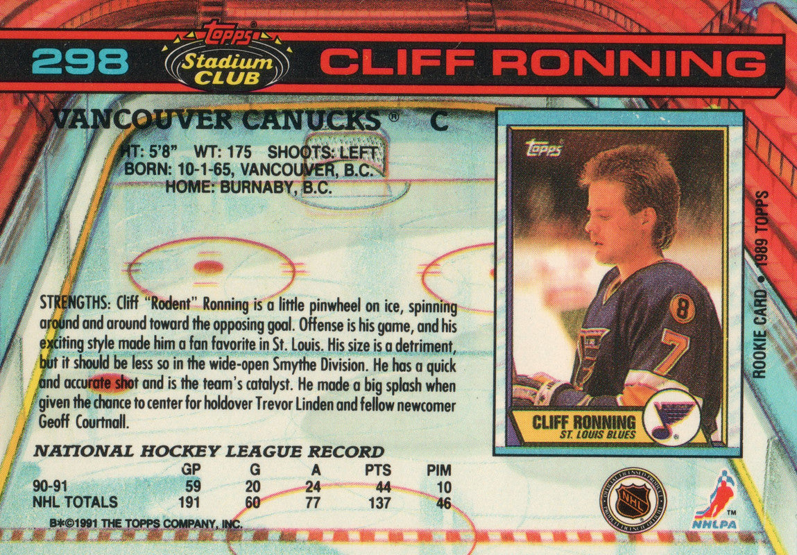#298 Cliff Ronning Vancouver Canucks 1990-91 Topps Stadium Club Hockey Card OS