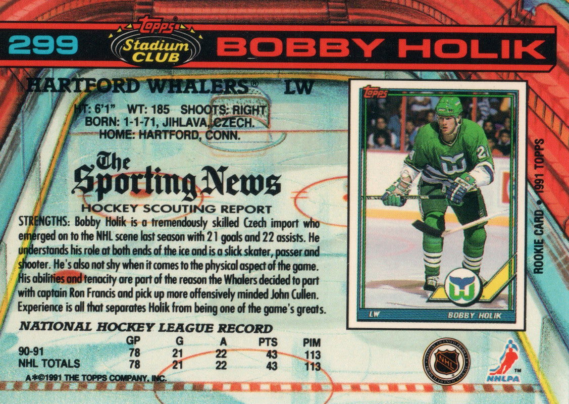 #299 Bobby Holik Hartford Whalers 1990-91 Topps Stadium Club Hockey Card OS