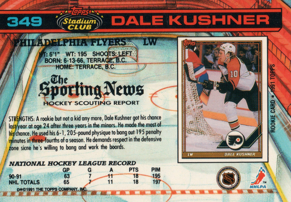 #349 Dale Kushner Philadelphia Flyers 1990-91 Topps Stadium Club Hockey Card OQ