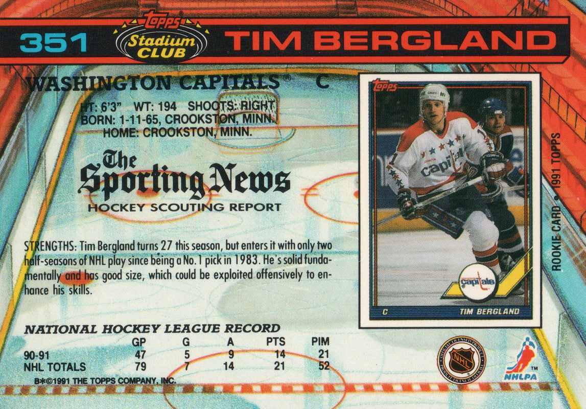 #351 Tim Bergland Washington Capitals 1990-91 Topps Stadium Club Hockey Card OQ