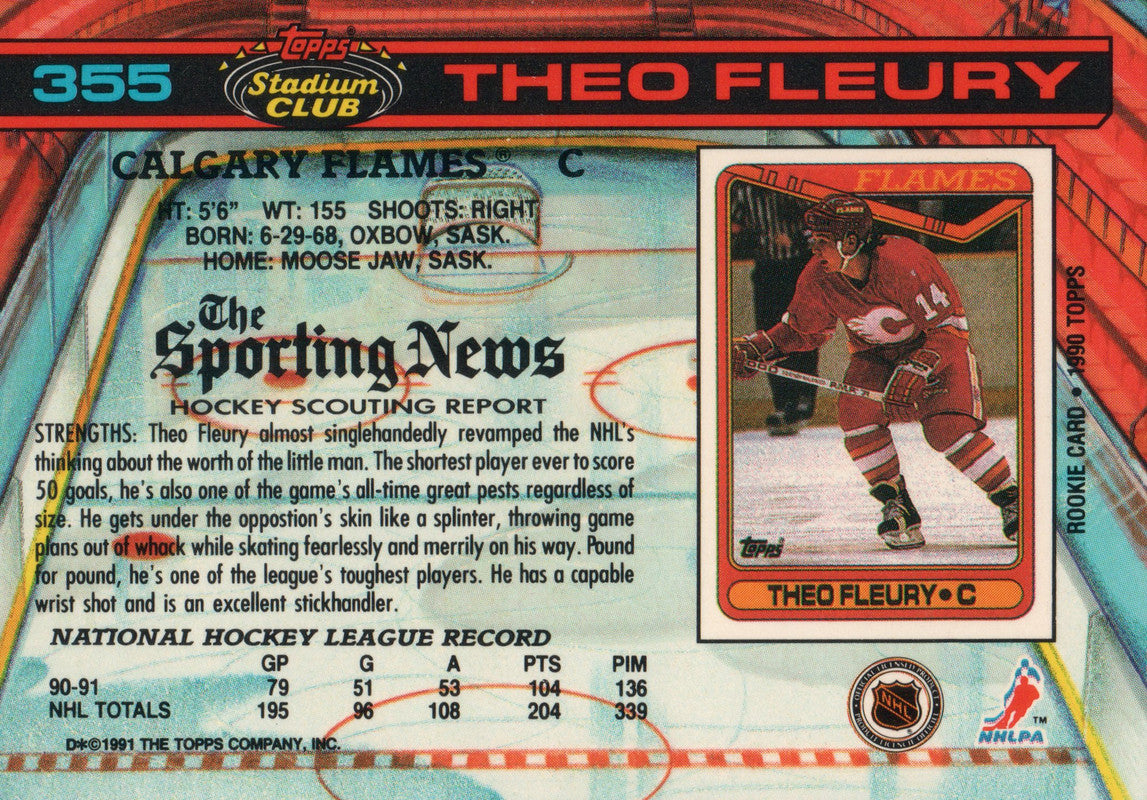 #355 Theo Fleury Calgary Flames 1990-91 Topps Stadium Club Hockey Card OQ