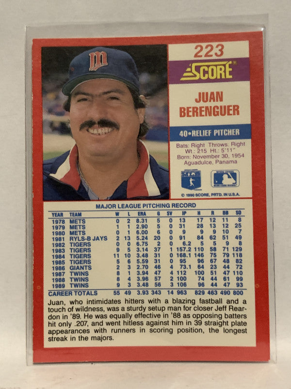 #223 Juan Berenguer Minnesota Twins 1990 Score Baseball Card