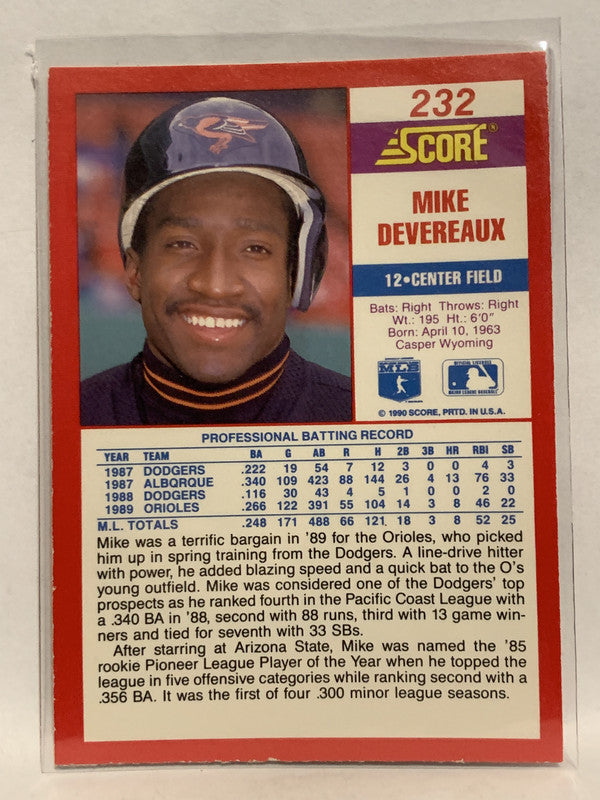 #232 Mike Devereaux Baltimore Orioles 1990 Score Baseball Card