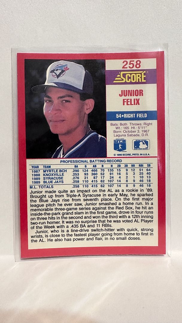 #258 Junior Felix Toronto Blue Jays 1990 Score Baseball Card