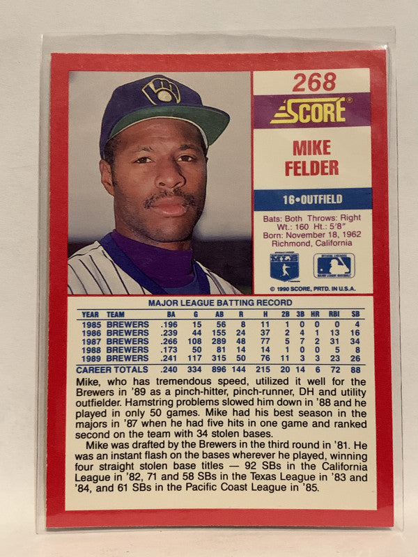 #268 Mike Felder Milwaukee Brewers 1990 Score Baseball Card