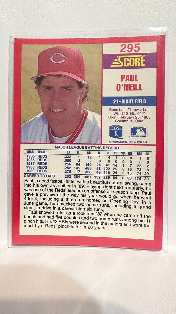 #295 Paul O'Neill Cincinnati Reds 1990 Score Baseball Card