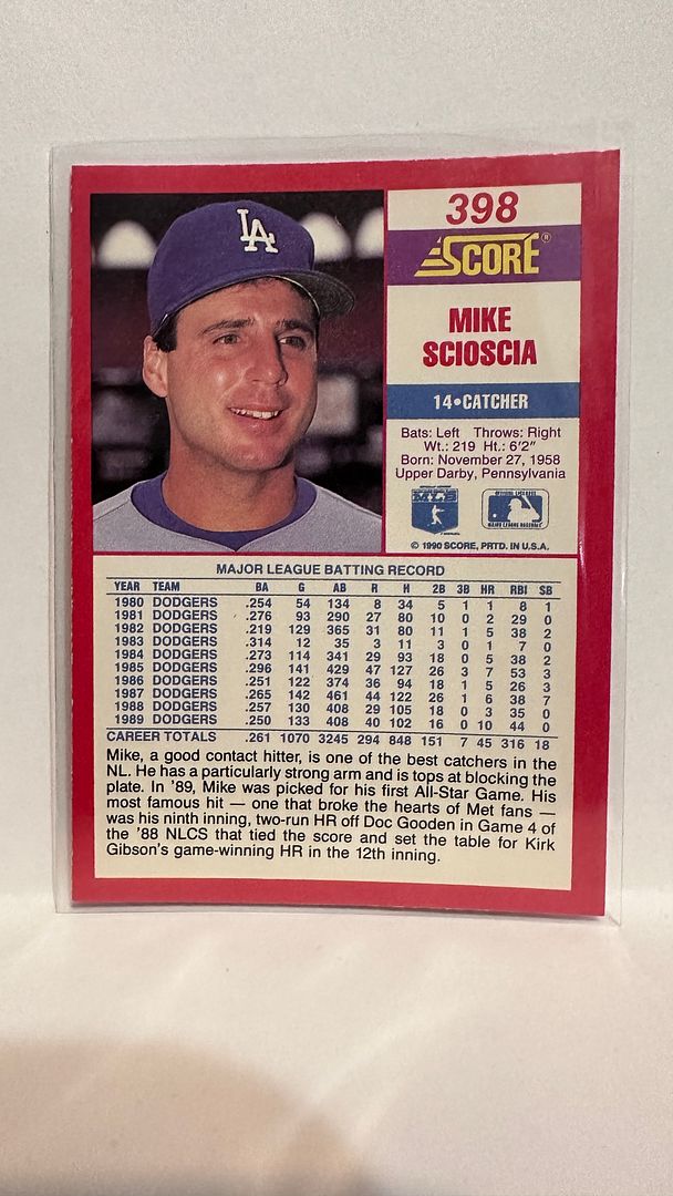 #398 Mike Scioscia Los Angeles Dodgers 1990 Score Baseball Card